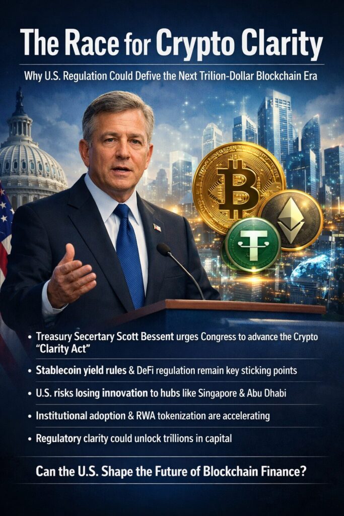 The global cryptocurrency industry stands at a pivotal crossroads. As digital assets evolve from speculative instruments into foundational financial infrastructure, governments are being forced to respond—not just with caution, but with urgency. In the United States, that urgency has been amplified by Scott Bessent, who recently called on Congress to finalize and advance the long-debated crypto market structure legislation known as the “Clarity Act.”