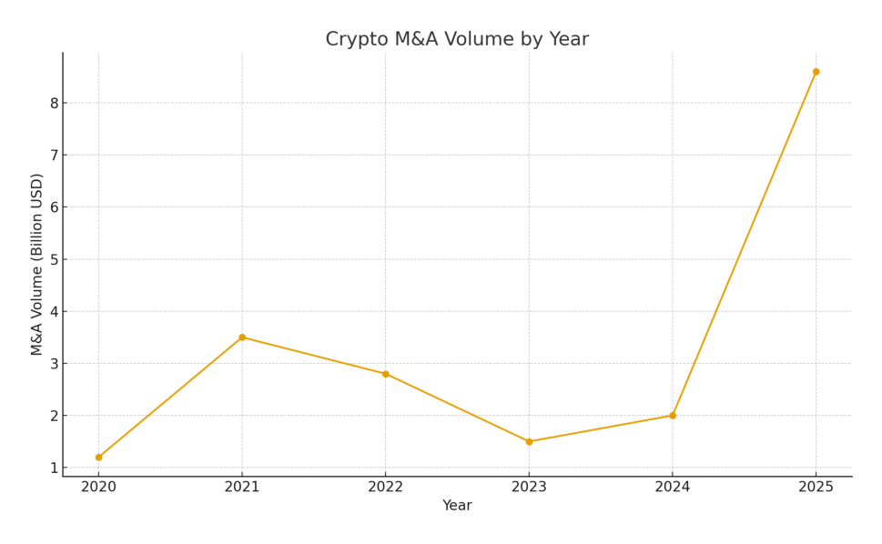 - Crypto M&A deals in 2025 reached $8.6 billion, surpassing the combined total of the previous four years.