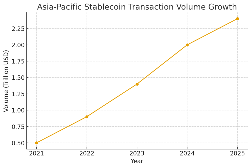 The Asia-Pacific region already commands the fastest growth in global stablecoin adoption—both in usage volume and institutional penetration. According to Circle, stablecoin transactions in the region exceeded $2.4 trillion between June 2024 and June 2025, driven by trade settlement, corporate treasury optimization, and the expansion of blockchain-powered supply chain systems.