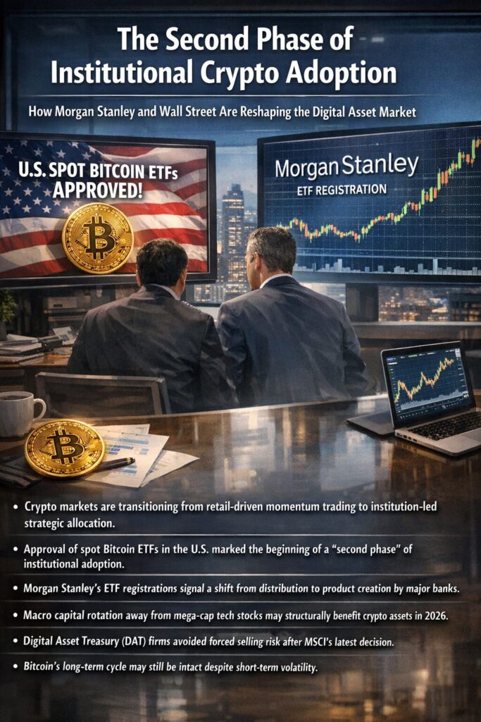 The cryptocurrency market is entering a new era. While headlines may focus on price volatility, the deeper story is institutional integration. Morgan Stanley’s actions, MSCI’s decisions, and macro capital rotation all point toward the same conclusion: crypto is moving from the margins to the core of global finance.