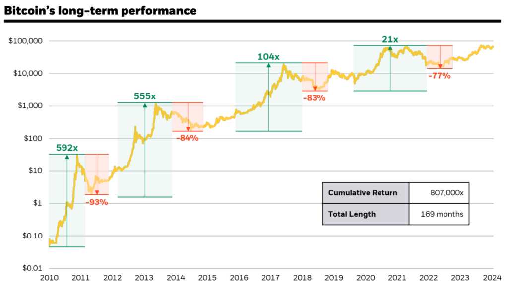 Long-term Bitcoin price chart annotated with halving events and ETF approval milestones.