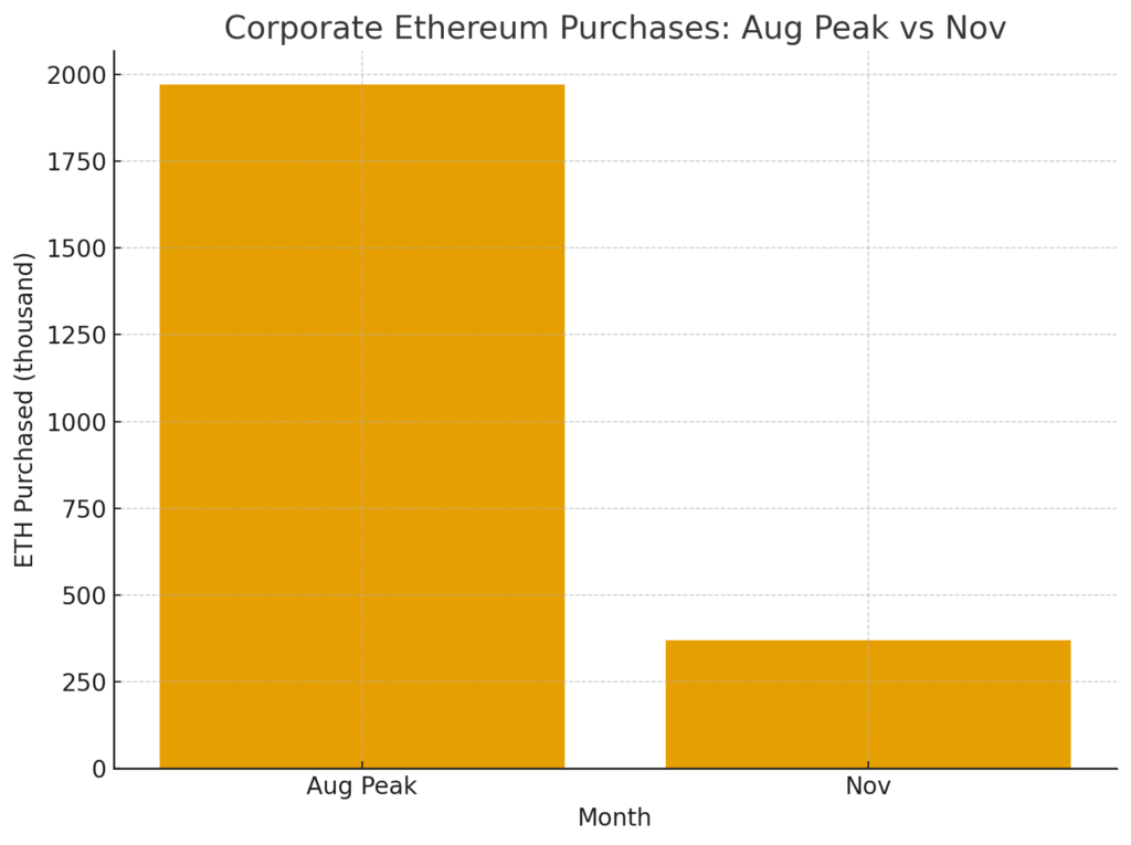 Ethereum has experienced a dramatic shift in corporate demand. According to new data released by Bitwise on December 2, aggregate corporate purchases of ETH in November plunged to 370,000 ETH, representing an 81% decline from the 1.97 million ETH peak in August.
