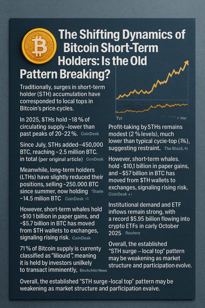 In the crypto-asset world, market participants often look at on-chain metrics as leading indicators. Among these, short-term holders (STHs)—those investors who acquired Bitcoin within the past ~155 days—are considered “weak hands” who are more likely to sell in response to volatility. Historically, when STHs accumulate aggressively, it often precedes a local peak in Bitcoin price, as speculative capital rushes in and then exits in profit.