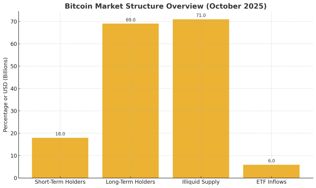 One of the structural changes reshaping Bitcoin’s behavior is the rising proportion of supply held in “illiquid” status. According to Glassnode, 71 % of Bitcoin’s circulating supply is currently classified as illiquid, meaning holders are unlikely to transact in the near term.