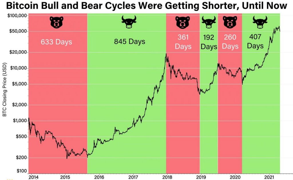 Description: A timeline chart comparing expected Fed rate changes with major Bitcoin bull and bear phases.