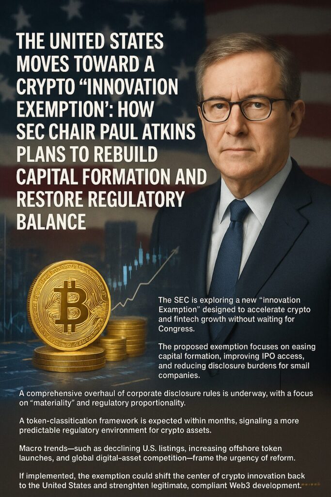 The U.S. Securities and Exchange Commission (SEC) is preparing for a dramatic realignment of its approach to digital assets, startups, and technological innovation. In a recent CNBC interview, SEC Chair Paul Atkins revealed that the agency is considering the introduction of a sweeping “Innovation Exemption”, a regulatory carve-out designed to accelerate new technologies—particularly cryptocurrency and blockchain—without waiting for new legislation from Congress.