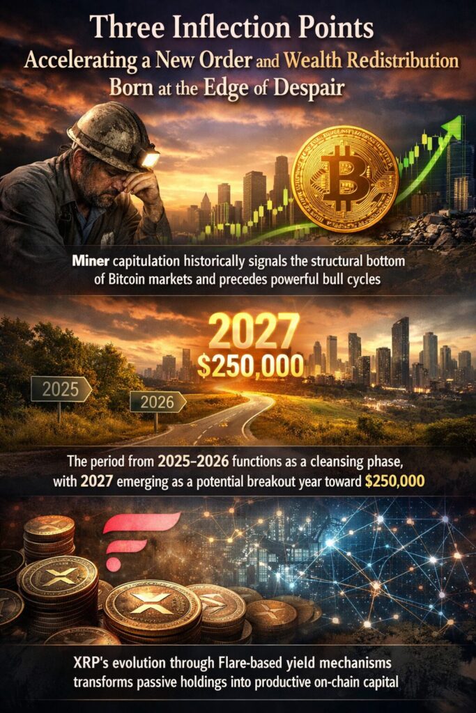 This article explores three critical inflection points now converging: miner capitulation as a bottoming signal, the macro-political and liquidity-driven path toward a potential $250,000 Bitcoin valuation by 2027, and the emergence of yield-bearing XRP through Flare-based decentralized finance. Together, these forces suggest not merely a cyclical rebound, but the formation of a new financial order.