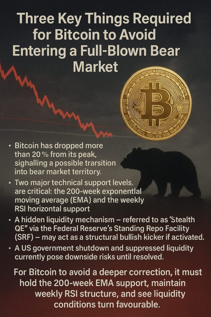 In summary, for Bitcoin to avoid sliding into a deeper bear market, three conditions must converge: it must maintain the long-term technical support at the 200-week EMA, hold the weekly RSI structure, and benefit from improved liquidity conditions (possibly via stealth QE). At present, we are in a state of flux: technical supports are being tested and liquidity is constrained due to the U.S. government shutdown. For investors seeking new crypto assets and practitioners working in blockchain, awareness of these macro-technical dynamics is key: not only the asset-specific fundamentals but the wider liquidity ecosystem and fiscal/monetary forces matter. If Bitcoin manages to defend the structural supports and liquidity turns positive, we may soon shift from corrective mode into accumulation mode — potentially signalling opportunity for the next phase of the crypto cycle.
