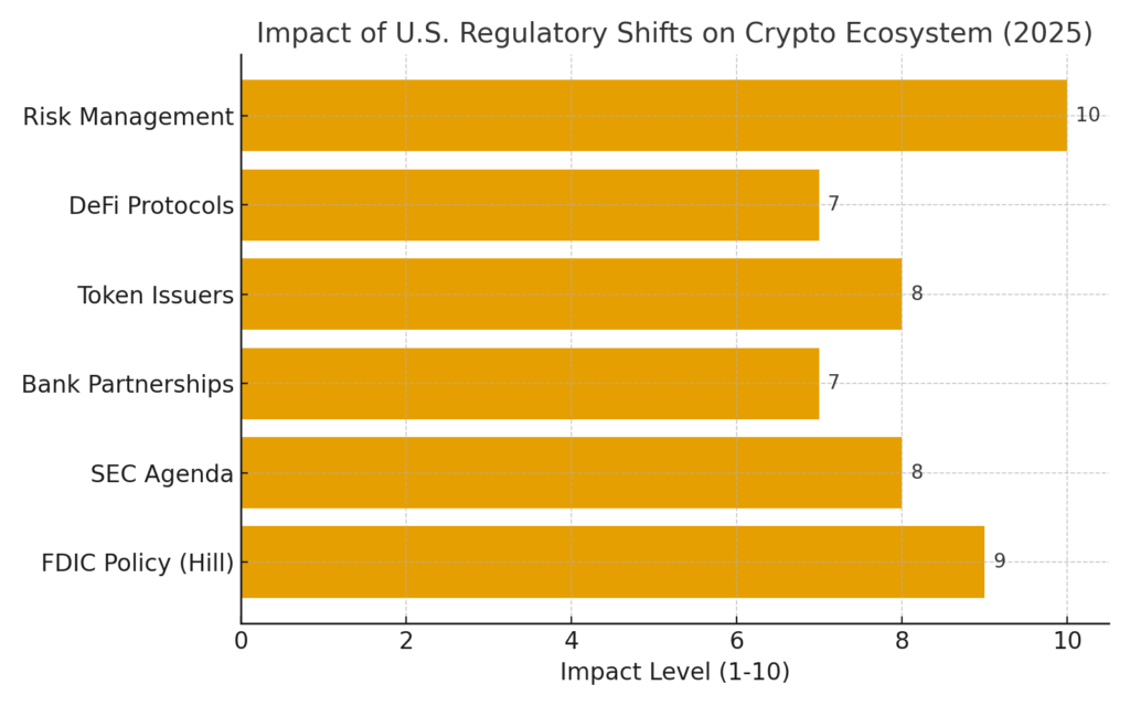 • Bank partnerships: Crypto projects might more easily partner with FDIC-insured banks for services like custody, fiat rails, or stablecoin reserves.
