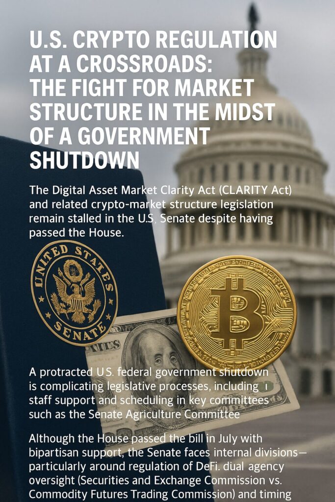 - The Digital Asset Market Clarity Act (CLARITY Act) and related crypto-market-structure legislation remain stalled in the U.S. Senate despite having passed the House.