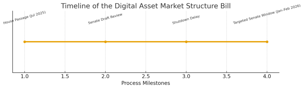 - Senators such as Tom Tillis (Republican) have publicly emphasised the need to pass crypto-market legislation in the window before the 2026 midterms (stating target for January–February).