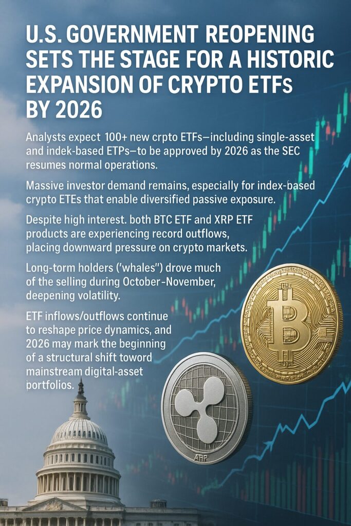 • Analysts expect 100+ new crypto ETFs—including single-asset and index-based ETPs—to be approved by 2026 as the SEC resumes normal operations.