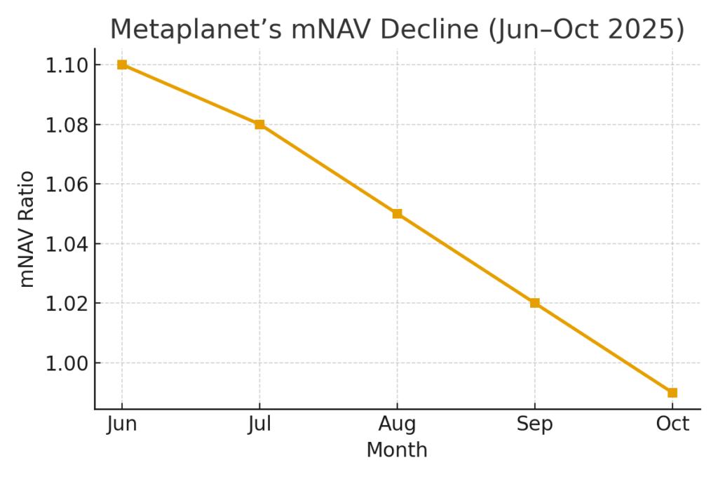 - Metaplanet’s mNAV dropping below 1.0 signals a dramatic inversion: the market values the company less than its Bitcoin holdings.