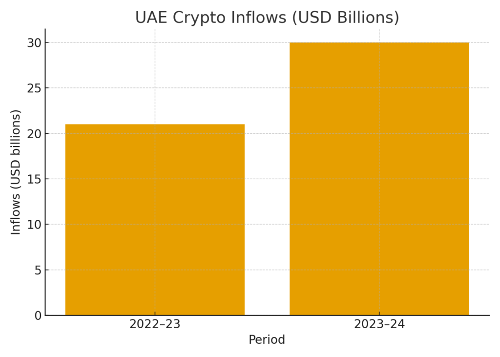 - The UAE recorded over $30B in crypto inflows in 2023–2024, a 42% YoY increase, highlighting growing institutional appetite.