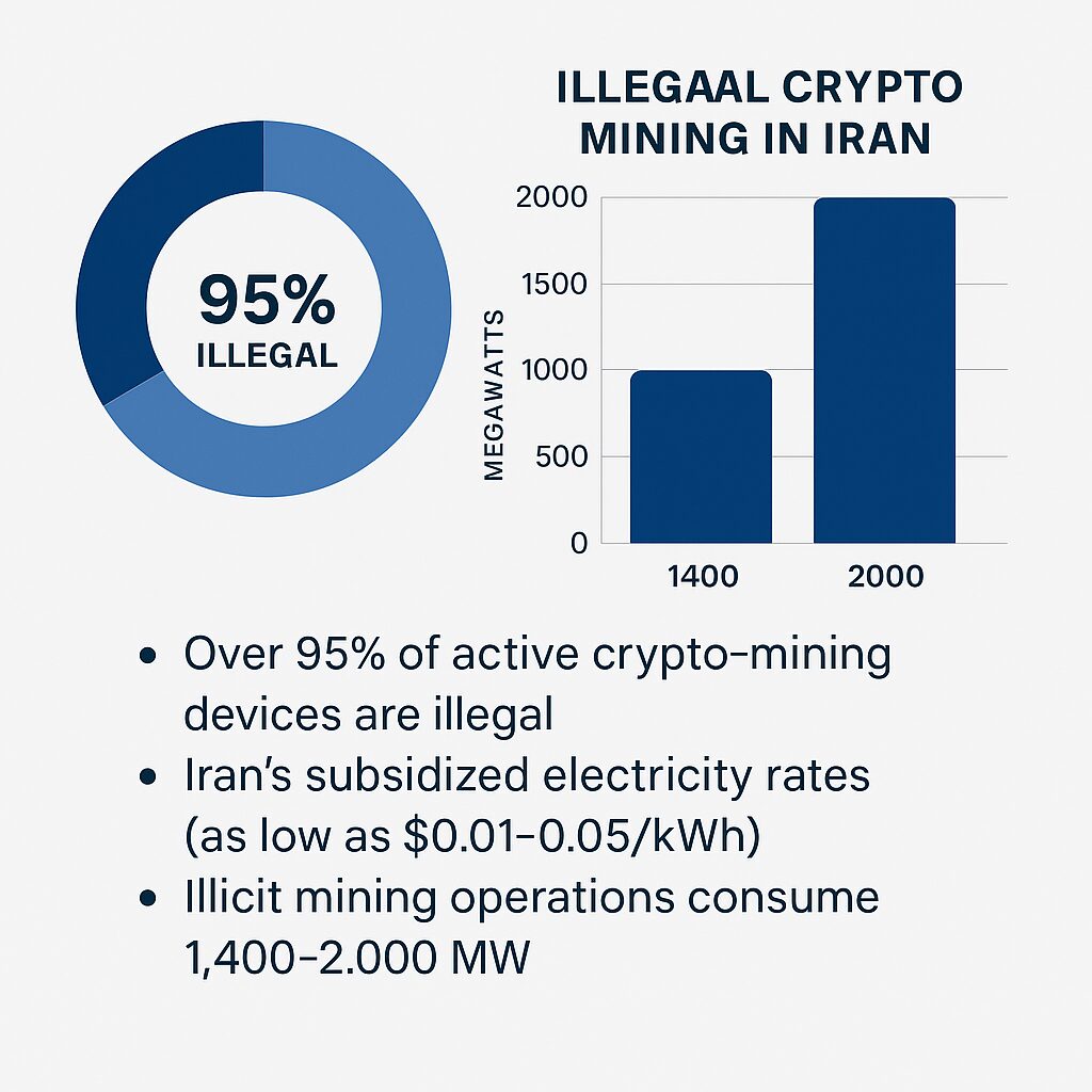 - Iran’s heavily subsidised electricity rates (as low as US $0.01-0.05 /kWh) have turned the country into a major global mining hub and a “paradise for illegal miners.”