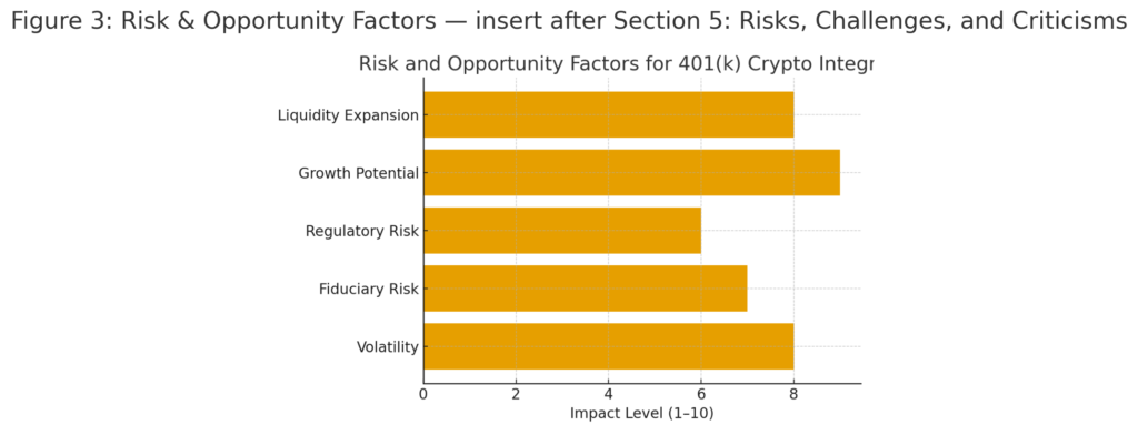 Large flows into crypto could amplify price swings, increase correlation with traditional markets, and raise concerns about systemic impacts. Critics warn that opening retirement accounts to crypto could be akin to embedding speculation in mainstream portfolios.