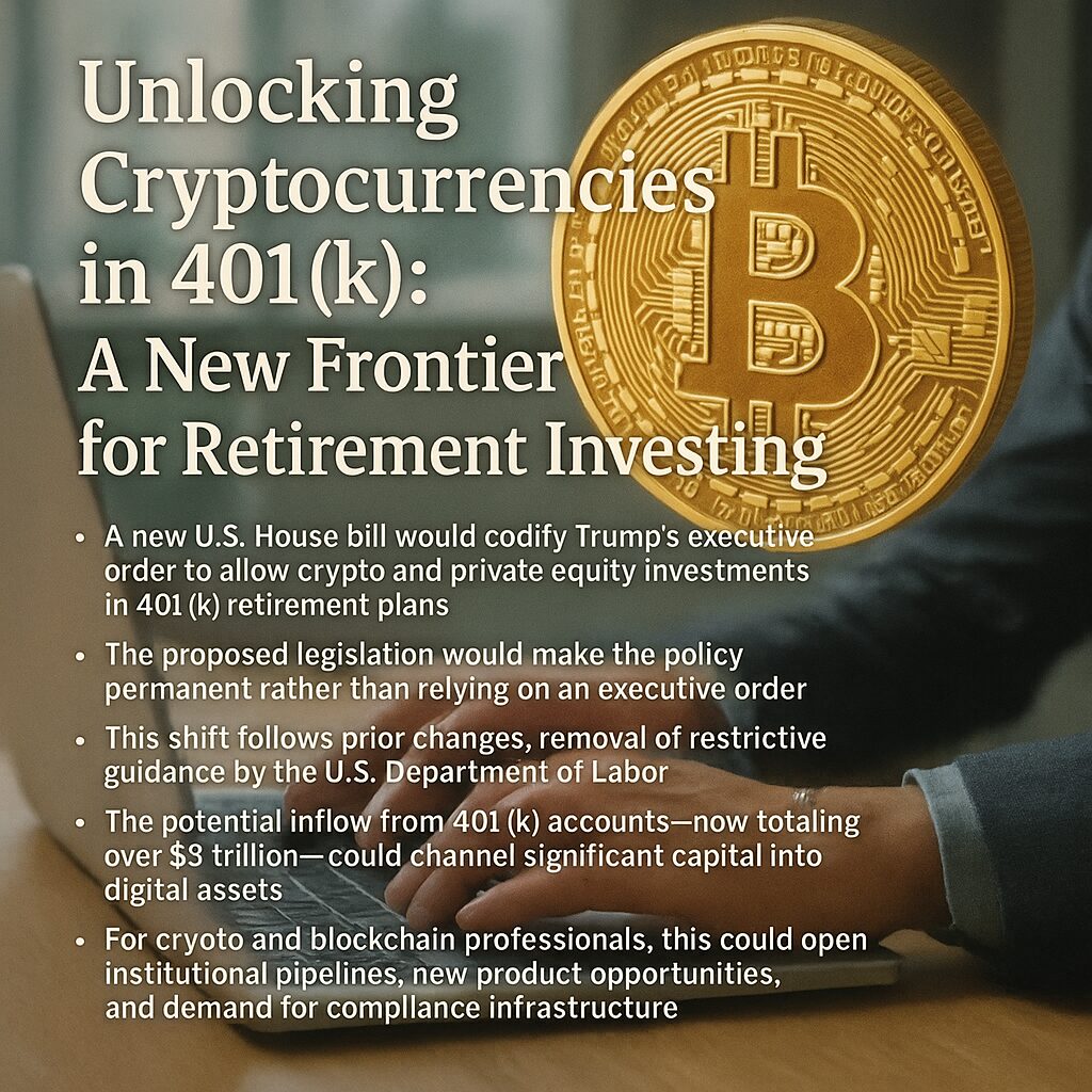 - A new U.S. House bill would codify Trump’s executive order to allow crypto and private equity investments in 401(k) retirement plans