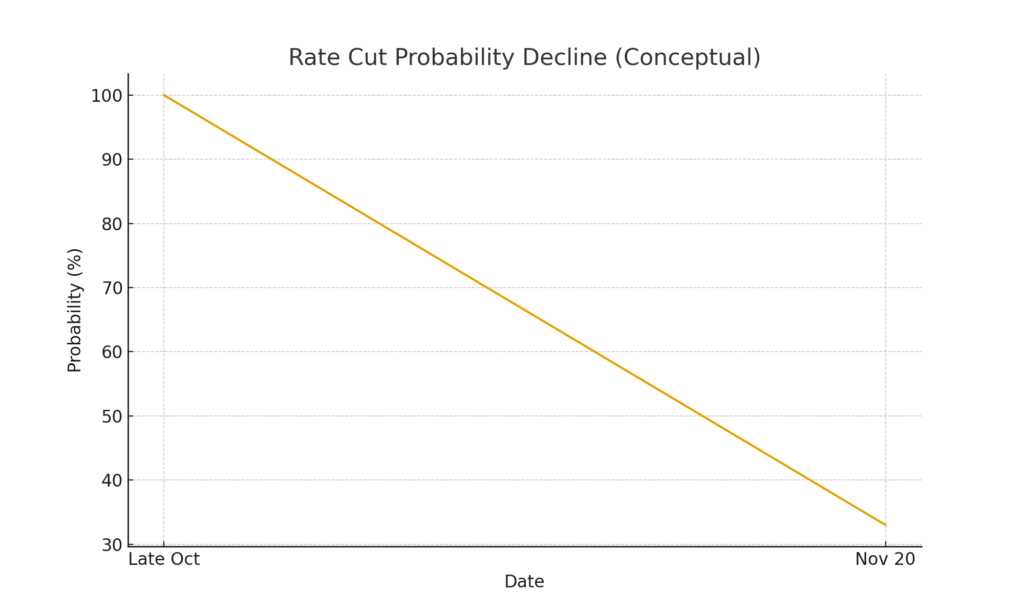 The abrupt collapse in rate-cut expectations has introduced new uncertainty into global markets. Crypto assets, which had rallied aggressively in October, have corrected sharply as investors reassess liquidity conditions.