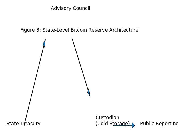 A flow diagram of a state-level Bitcoin reserve architecture: Treasury → Advisory Council → Custodian (Cold Storage) → Reporting.