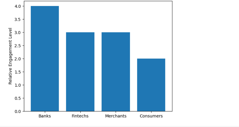 This diagram illustrates the relative engagement of banks, fintechs, merchants, and consumers within Visa’s stablecoin ecosystem.
