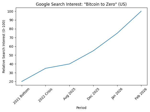 Google Trends measures relative interest on a 0–100 scale. A reading of 100 does not mean the majority of Americans believe Bitcoin will go to $0; rather, it means that searches for that term are at their highest relative intensity compared to previous periods. The data reflects rising retail anxiety.