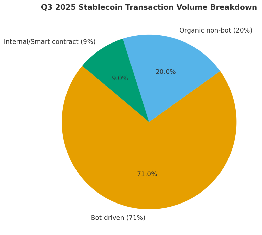 “Organic” non-bot transactions — those that more plausibly correspond to human users moving funds, remittances, payments, or exchanges — made up only about 20 % of total volume. The remaining 9 % is attributed to internal smart contract flows or exchange internal operations.