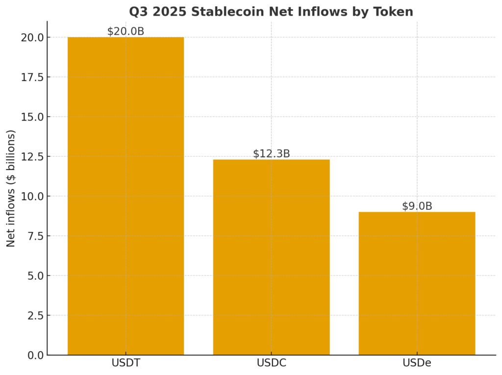 - Q3 saw net inflows of stablecoins > $46 billion, led by USDT (~$20B), USDC (~$12.3B), and synthetic stablecoin USDe (~$9B).