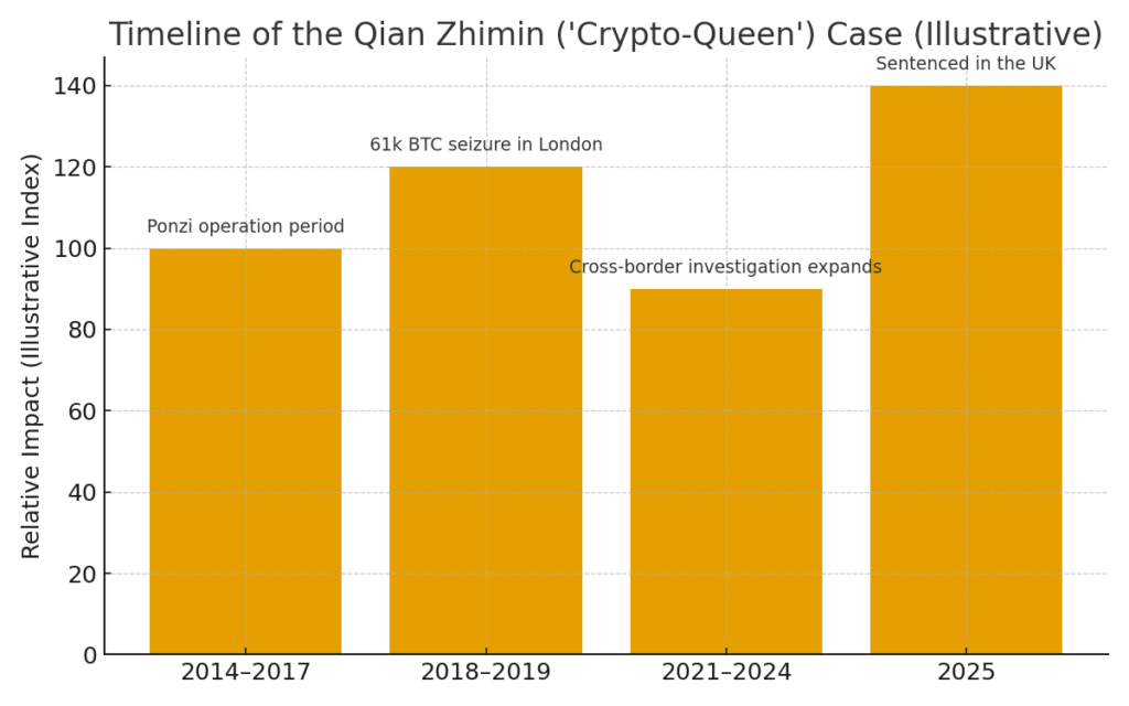 - A Chinese national, Qian Zhimin (also known as “Crypto-Queen”), was sentenced in the UK to 11 years 8 months for orchestrating a large-scale Ponzi scheme and laundering crypto assets.