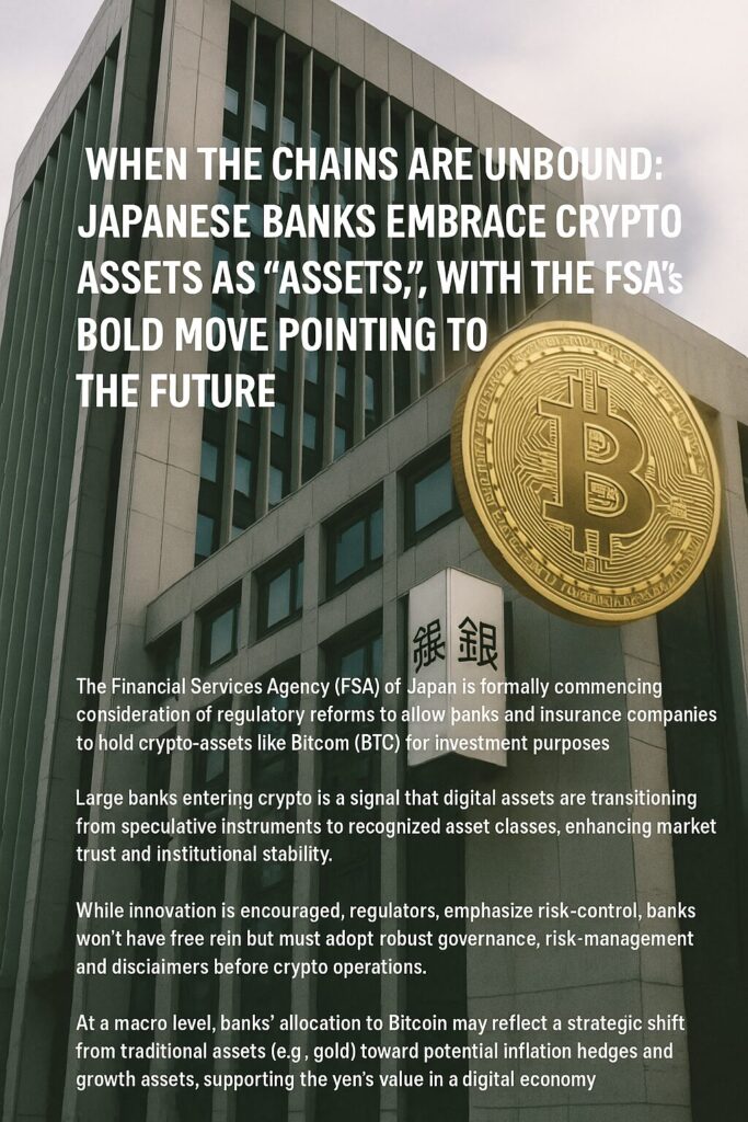 However, this is not a free-for-all: the regulator is emphasising governance, risk management and investor protection. The opportunity lies in building assets and applications that meet higher standards—custody, transparency, regulatory compliance. The macro-financial dimension adds further depth: banks may shift from gold and cash into Bitcoin and tokenised assets as inflation hedges and portfolio diversifiers, while also reinforcing Japan’s digital economic posture. On the global stage, Japan is seeking to re-assert its competitive strength in fintech and digital assets, and its regulatory model may become a benchmark across Asia.