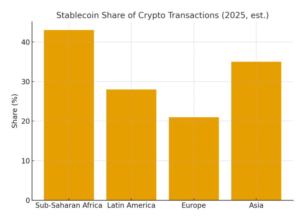 As of 2025, stablecoin transactions in Sub-Saharan Africa make up 40-43 % of all crypto moves—underscoring their importance.