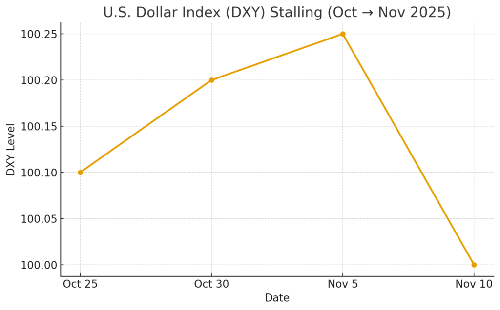 And the U.S. Dollar Index (DXY), which often moves inversely to risk appetite, appears to be losing its upward momentum — another sign that the macro backdrop may be shifting from “risk-off” toward “risk-on.”