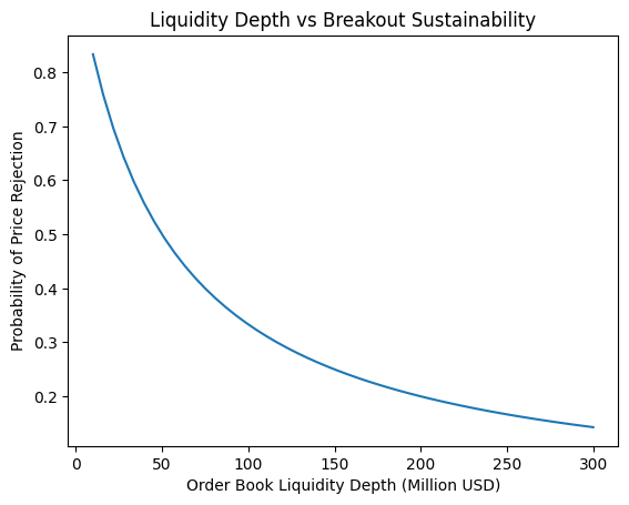 Figure 2 demonstrates the inverse relationship between liquidity depth and breakout rejection probability.