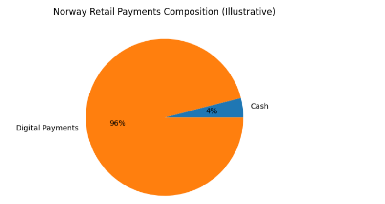 Norway is often cited as one of the world’s most cashless economies. Physical cash usage in retail transactions is estimated to be below 5%, among the lowest globally. Debit cards, mobile payments, and instant bank transfers dominate everyday commerce.