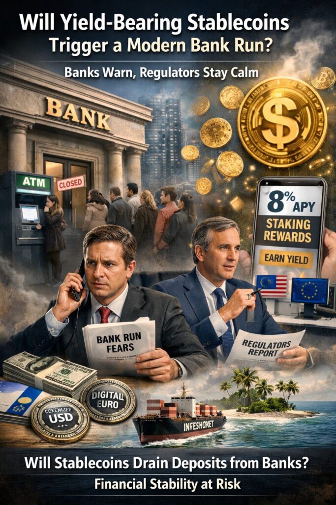 - Banks warn that yield-bearing stablecoins could accelerate deposit outflows and weaken traditional lending capacity.