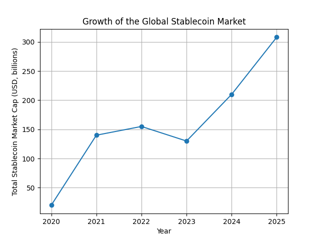 This chart illustrates the rapid expansion of stablecoins from 2020 to 2025, highlighting why banks are increasingly focused on their systemic implications.