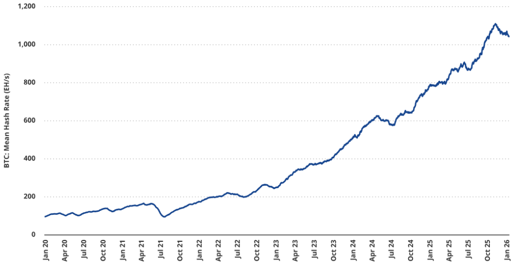 - A severe winter storm in the United States caused a temporary ~10% drop in Bitcoin’s global hashrate, one of the largest short-term declines in recent years.