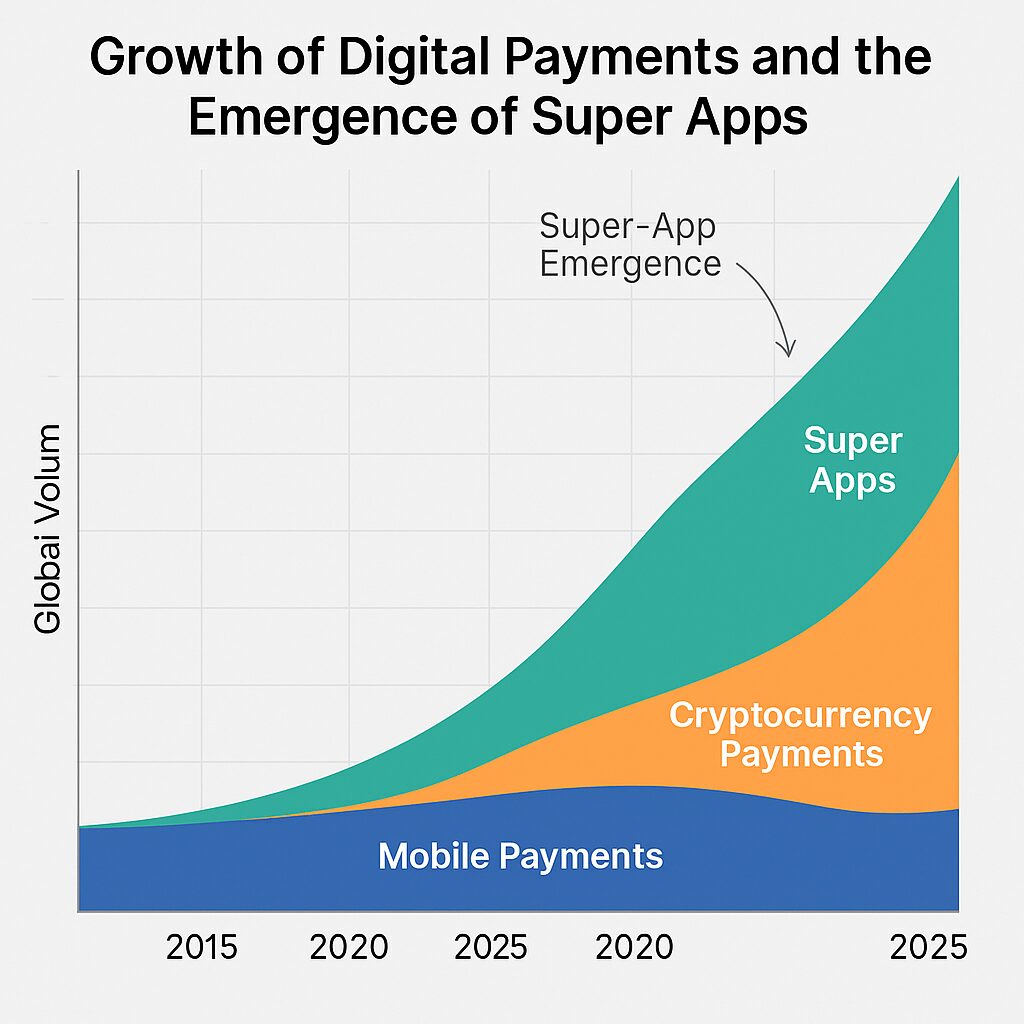 → Insert a professionally styled infographic here (e.g. trend line from 2015-2025 showing mobile payments, crypto adoption, and super-app growth)