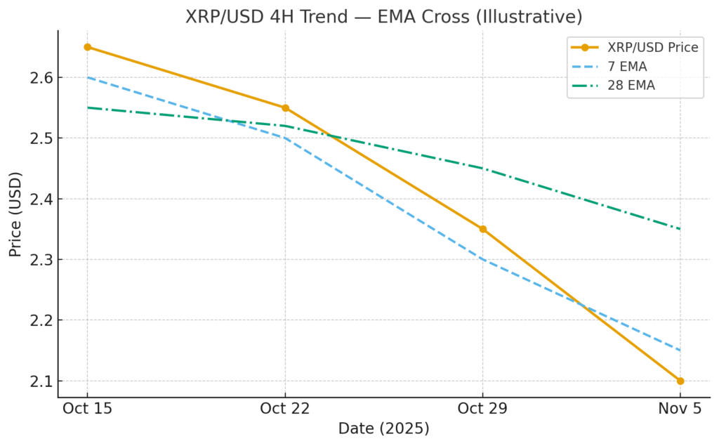 From a technical perspective, the 4-hour chart of XRP shows a clear downward bias. The short-term 7-period EMA has crossed below the 28-period EMA—forming what many chartists call a “dead cross” (or death cross) on that timeframe. This type of crossover suggests that short-term momentum has turned lower and the moving averages themselves now function as resistance. The original article you referenced described this: the 7 EMA dropping beneath the 28 EMA and price staying under both.