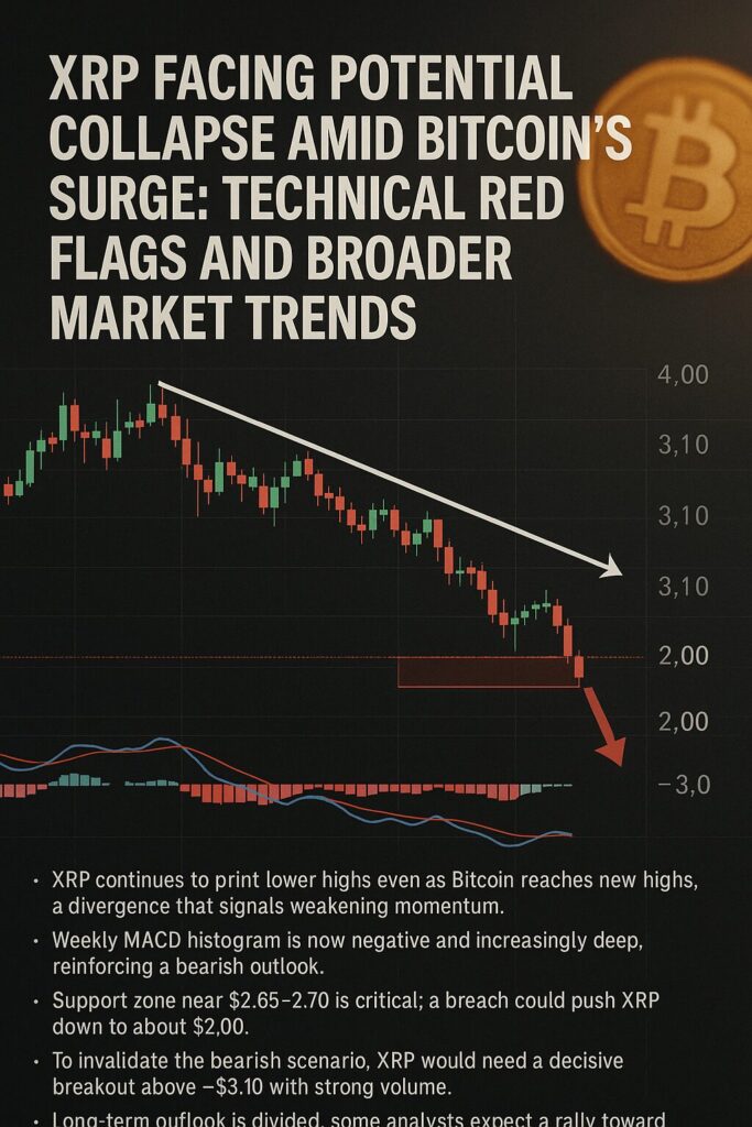 In summary, the original article warns of a looming XRP collapse if technical support breaks and Bitcoin pulls back. It emphasizes that XRP’s pattern of lower highs amid Bitcoin’s new highs is a strong red flag, and the weakening weekly MACD histogram reinforces the bearish view.