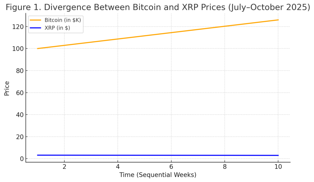 In the source article, Omkar Godbole points out a concerning pattern: while Bitcoin continues to post fresh all-time highs, XRP has consistently failed to do so. This “lower highs” pattern (where each successive peak is lower than the previous one) is a hallmark of weakening demand and diminishing bullish conviction. In normal times, many altcoins move in sympathy with Bitcoin, but when an altcoin begins lagging, it often is more vulnerable when Bitcoin pulls back. The divergence suggests that XRP’s buyers are reluctant to commit near higher levels.