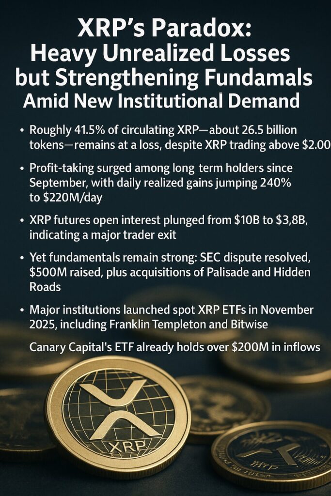 Throughout 2025, Ripple’s native token XRP has presented one of the more interesting contradictions in the digital asset market. On one hand, the token is trading above the psychologically important $2.00 level, its highest sustained price band in years. On the other hand, new on-chain data shows that over 41.5% of all circulating XRP is currently held at a loss, raising questions about investor sentiment and near-term price direction.